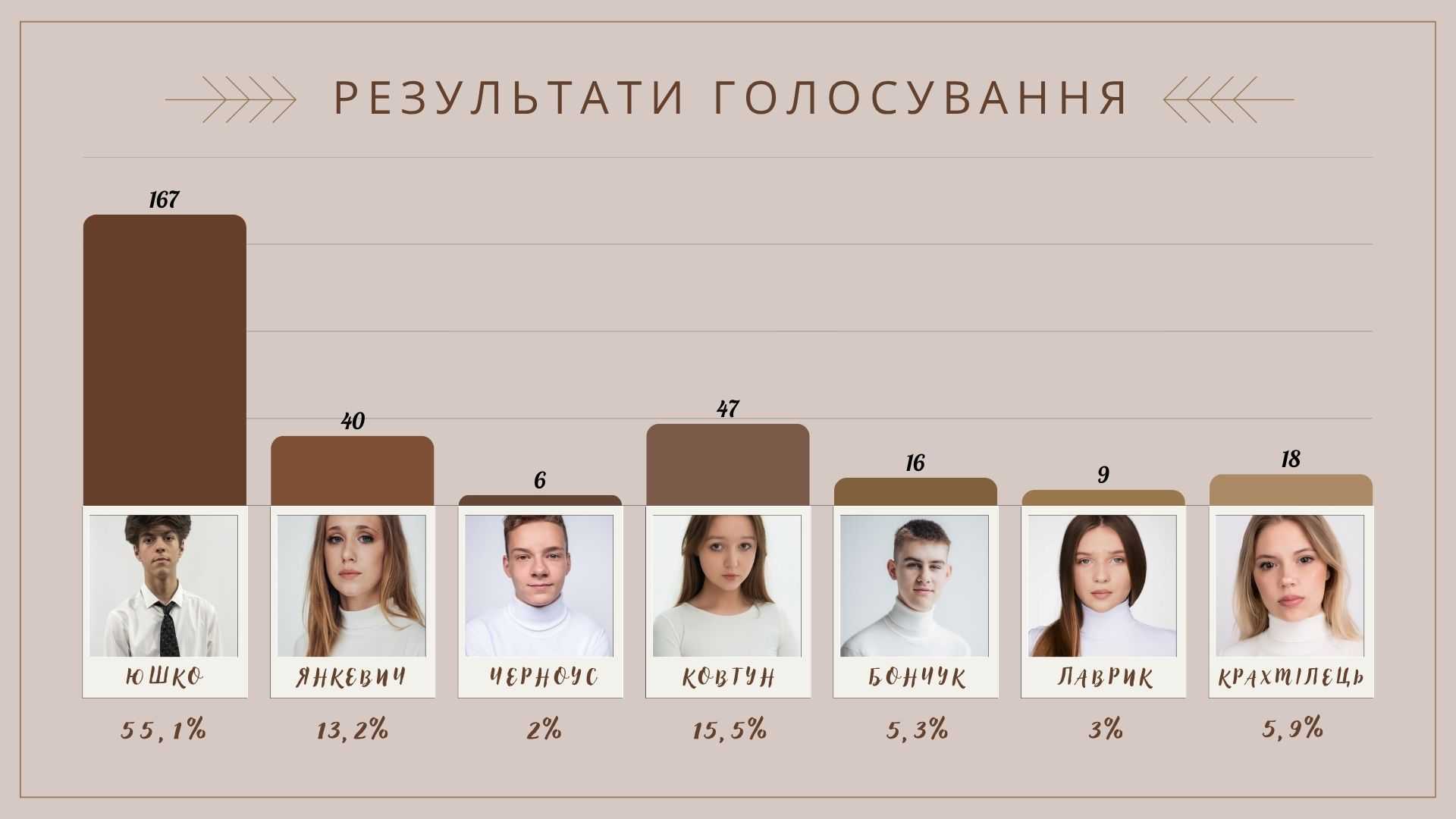 - Результати переможця: Юшко Назар Максимович отримав 167 голосів, що складає 55.1% від усіх поданих голосів.